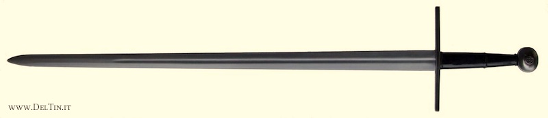 Der Greif bei uns ist ein Schildhalter. Statt ein (Wappen)schild zu stützen, hält er bei uns ein Langschwert aus dem 14. Jahrhundert. Charakteristisch für diese frühe Variante dieser Fechtwaffe ist der noch (fast) runde Knauf, die gerade Parierstange und der recht kurze Griff.